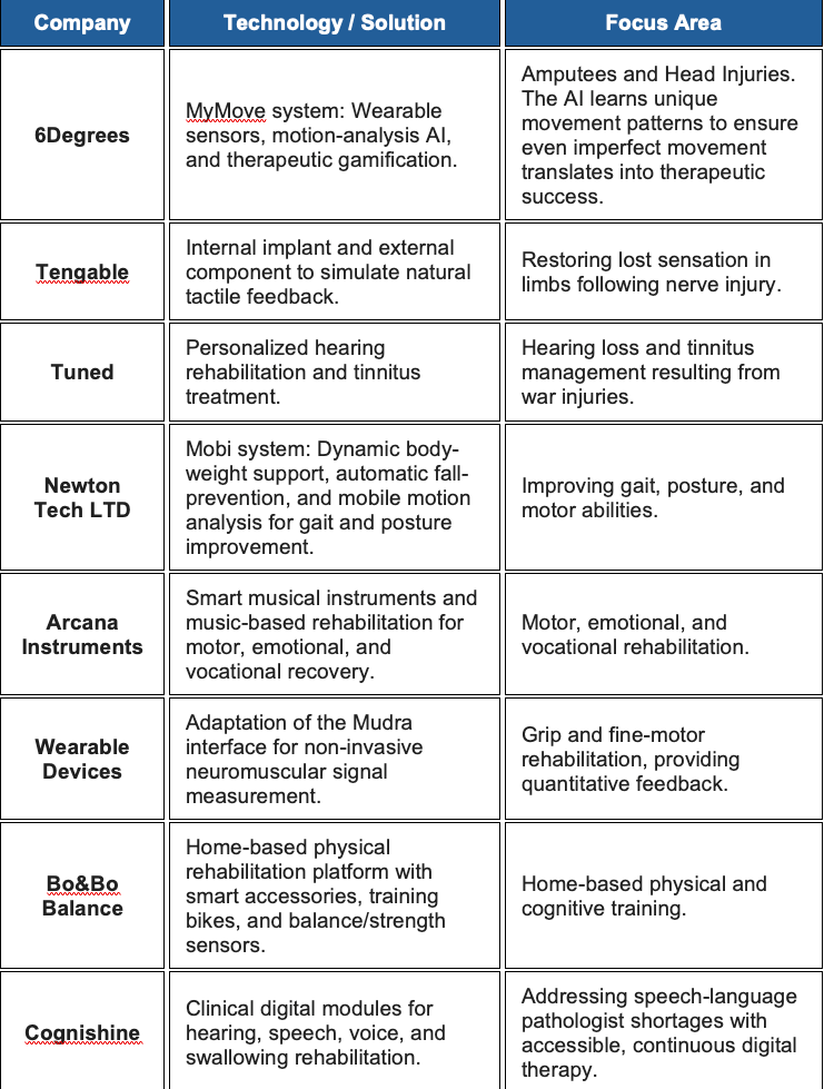 The selected companies and their technologies showcase the future of rehabilitation, moving far beyond traditional physical therapy:
